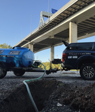 We can provide an excavator and plant to excavate the required sized pit or use plant that’s available on site. Then with our petrol engine pump on our 2000ltr bowser, fill the pits with water, then carry out BRE365 Soakaways to determine the percolation within the natural strata.